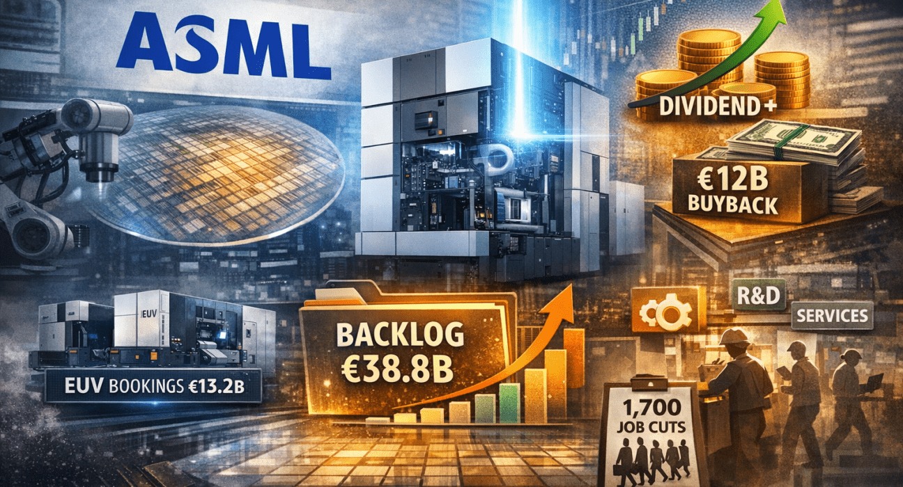 ASML stock surged 6% on Wednesday, after the Dutch semiconductor equipment maker posted record results and announced a €12 billion three-year buyback program alongside a 17% dividend hike. While the investors focused on the capital returns, the company’s earnings revealed a much deeper story. A backlog loaded with high-margin products and multi-year customer commitments that